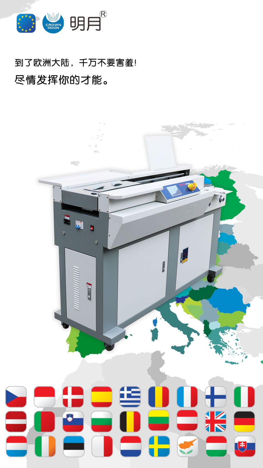 此次通过CE认证的明月胶装机系列产品,在智能无线胶装技术及用户体验上,实现采用了多重“保障”屏障,从研发到选材到生产制造等方面,在用户身边构建一道道保护,以智能、安全、高效、环保、节能等优势深受客户喜爱,产品远销欧美、东亚、东南亚、中东等四十多个国家和地区。
