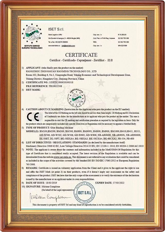 为了扩大出口业务,赢得国际市场尤其是要求苛刻的欧洲市场,我司明月系列胶装机于2019年3月成功通过CE认证,并获得了欧盟CE认证证书,为我司产品出口欧盟,打开国际市场创造了有力条件。